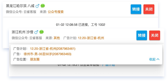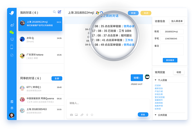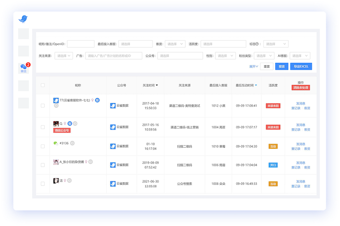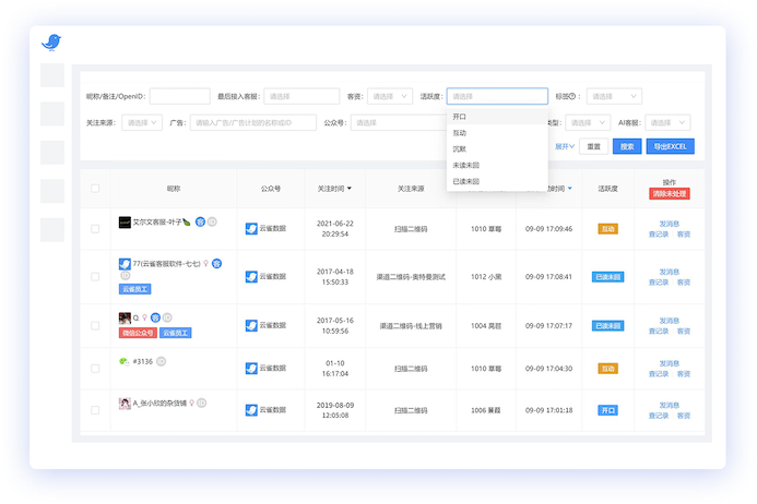 活跃度分为开口/互动/沉默/已读未回/未读未回五种类型,直观了解粉丝当前状态,以便客服快速处理对话