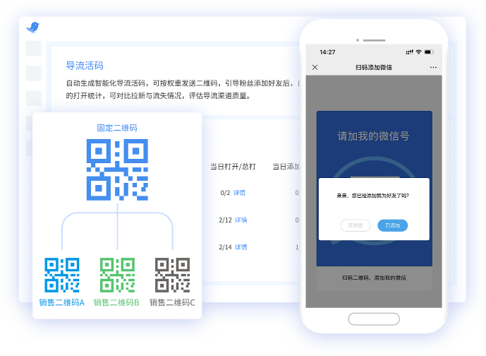 -支持自动打标签、询问粉丝添加状态、上报客资转化行为、统计二维码数据等,为个微/企微高效导流,帮助企业沉淀私域流量。